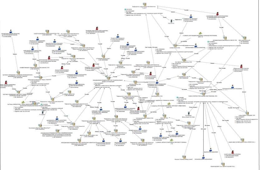 Ключевыми элементами влияния выступают десятки компаний, такие как ТОО «3 A&T;», DASM Service, Big Idea Group, 360 Production. Эти компании якобы участвуют в отмывании средств, поддерживают пропагандистскую деятельность и финансируют фиктивные организации.