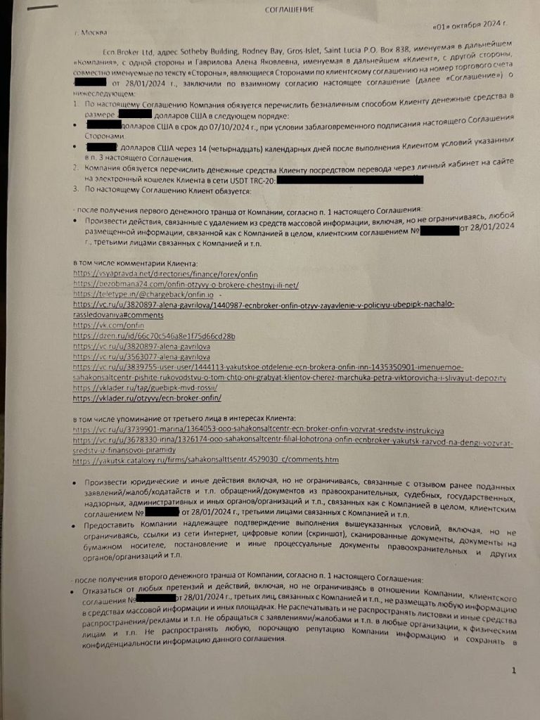 Через некоторое время со мной на связь вышел юрист (нанятый ECN (ONFin) брокером) для заключения мирного соглашения.