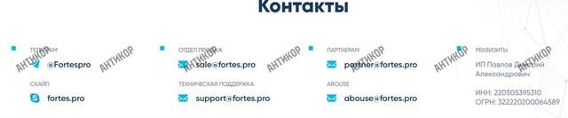 Конечно, почти полное совпадение доменных имен и названий тоже может быть чистым совпадением. Но дальше еще интереснее – сайт fortes.pro, который принадлежит ресурсу с названием Fortes, не имеет никаких данных о том, кому он принадлежит. Обычно эти сведения содержатся или в разделе "контакты", или же «в подвале», то есть внизу головной странички. Однако внизу главной страницы этих данных нет, а раздел «контакты» выглядит следующим образом.
