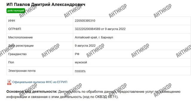 Из реквизитов, на которые предлагается осуществлять платежи, можно догадаться, что ресурс Fortes принадлежит ЧП Павлову Дмитрию Александровичу. Это же подтверждает и Пользовательское соглашение, которое можно найти на том самом месте, где должны указываться владельцы ресурса. Поскольку нам известен ИНН гражданина Павлова (220505395310), то найти сведения о нем довольно легко. Павлов Дмитрий Александрович зарегистрирован в качестве частного предпринимателя в Барнауле.