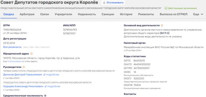 Но вернёмся к Денисову который как нитка за иголкой следовал за своим боссом по карте Подмосковья. Кстати, Ходырев, судя по выписке ЕГРЮЛ, с октября 2024 года числится главой совета, а Денисов - его первым заместителем.