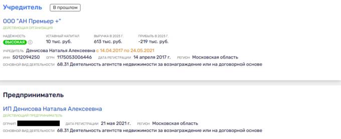 Её тезка - Наталья Денисова на сегодня работает в Подмосковье как ИП в сфере агентств недвижимости. До этого дама была владельцем ООО «АН Премьер +» в Балашихе. В 2021 году она вышла из числа владельцев, оставив доли некой Надежде Астаховой, которой также принадлежит ООО «АН Премьер», ликвидированный в 2017 году.