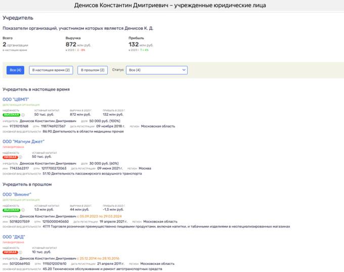 Итак, в ЕГРЮЛ есть Константин Дмитриевич Денисов, на которого были оформлены доли в четырех компаниях Москвы и Подмосковья.