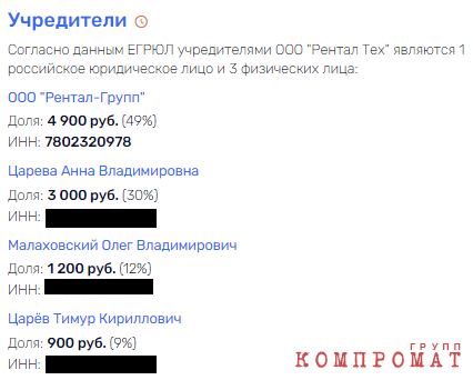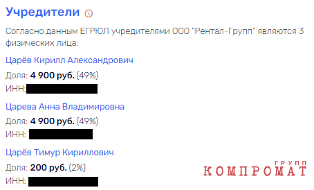 Сам Царёв остаётся совладельцем ООО "Рентал-Групп" с долей в 49%. Причём доля не находится в доверительном управлении, несмотря на то, что Царев - фактически чиновник. Еще 49% компании принадлежит Анне Царевой, и 2% - Тимуру Цареву, судя по всему, близким родственникам топ-менеджера.