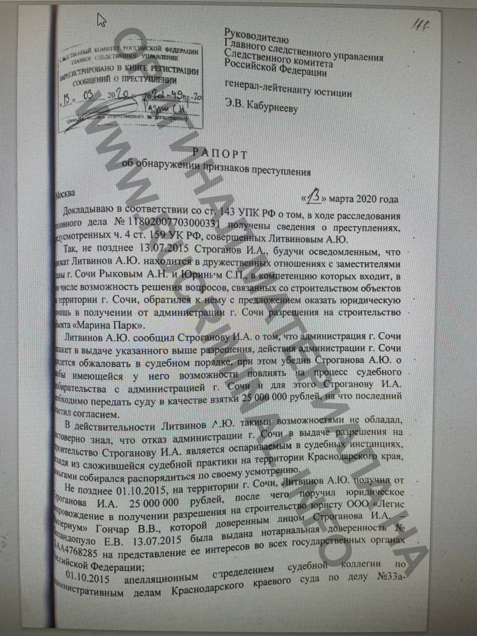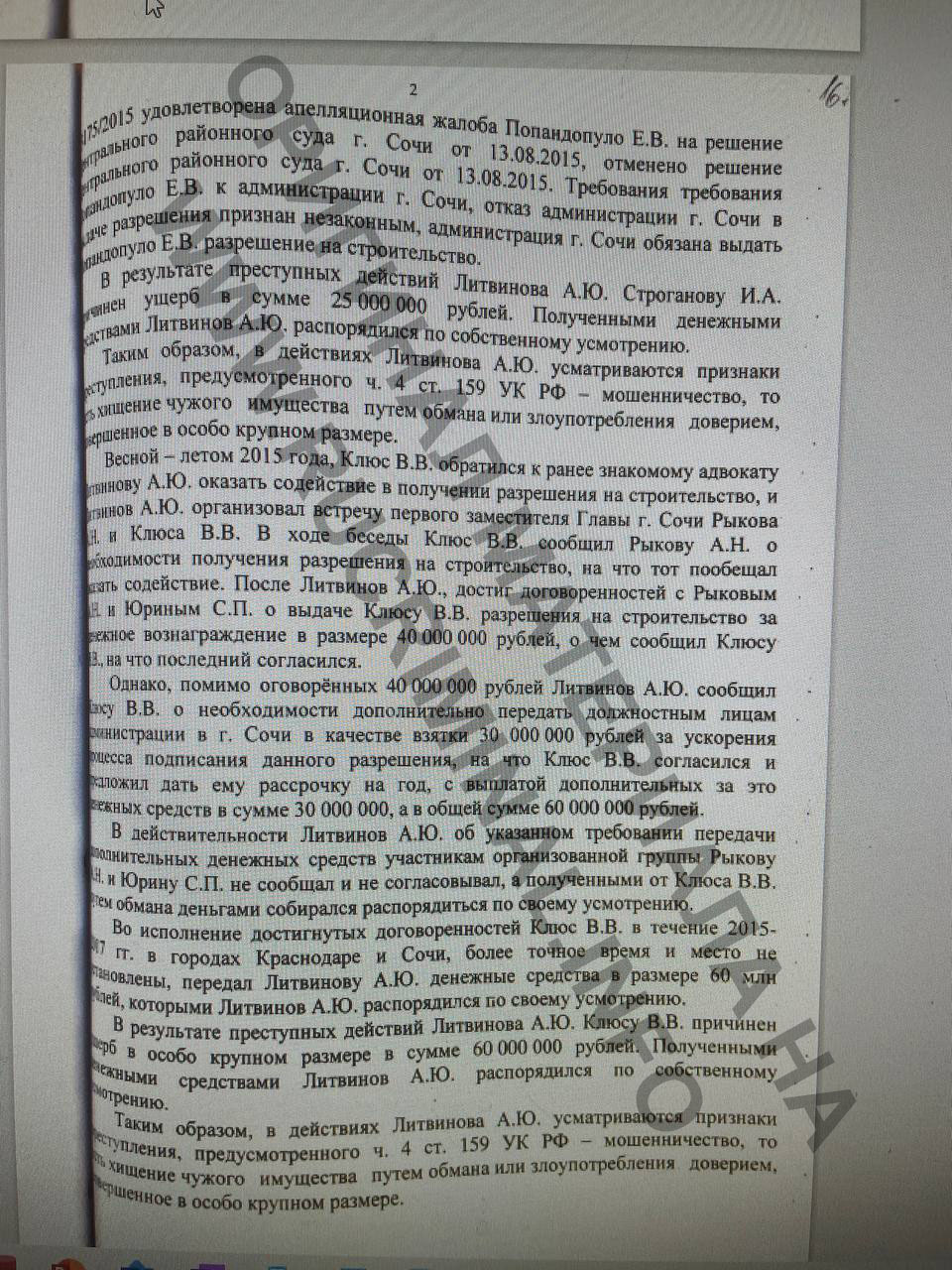 Руководитель следственной группы ГСУ СК РФ А.В. Саливоник установил, что Рыков А.Н. получил от Строганова И.А. не менее 25 млн.руб. за якобы имеющиеся у него возможности повлиять на судебный процесс с администрацией Сочи.
