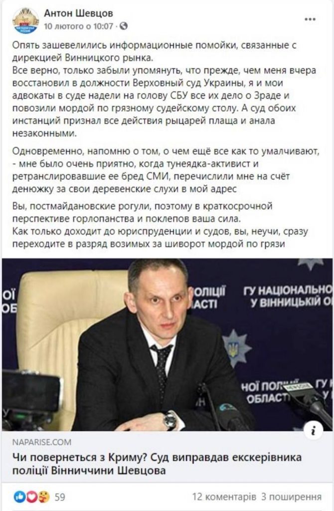 Та Феміда була сліпою… 2021 року Верховний Суд визнав протиправним наказ Нацполіції про звільнення екс глави поліції Вінницької області Антона Шевцова з посади. Верховний Суд поновив на посаді колишнього главу поліції Вінницької області Антона Шевцова, якого підозрювали у зраді. Про це 12 лютого 2021 року повідомило Бюро судової інформації з посиланням на постанову Касаційного адміністративного суду. Колегія суддів визнала протиправним наказ Нацполіції від 14 березня 2016 року про звільнення Шевцова з посади. Також Шевцов просив виплатити йому майже 62 тис. грн за час вимушеного прогулу, але цю частину позову передали на новий розгляд до Окружного адміністративного суду Києва.