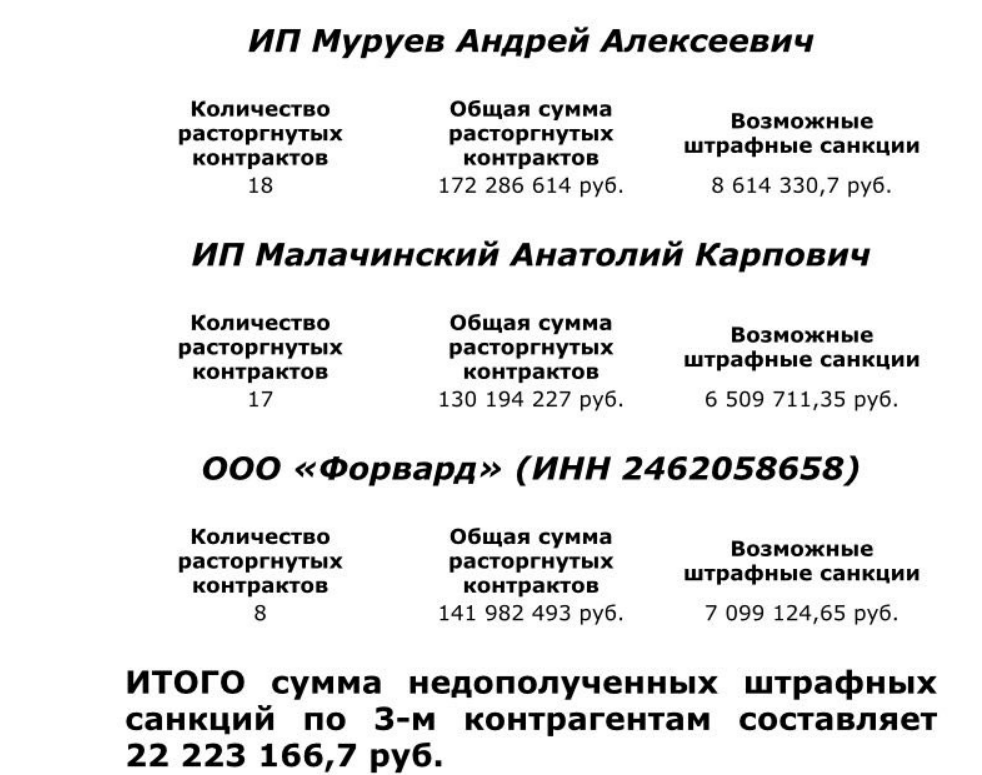 Кроме этого, контракты получили ИП Малачинский и ООО «Форвард». Самое интересное , что и МуруевАйсберг, и Малачинский, и «Форвард» ранее не выполнили более 40 государственных контрактов. При этом «бизнес ангел» Игорь Петеримов легко простил им этот факт, не внес в список неблагонадежных контрагентов, не вменил штрафные санкции. Федеральные СМИ сообщали о десятках таких случаев с одними и теми же фигурантами https://4bux.org/novosti/item/73304-meriya-norilska-i-kupreenko-probili-ocherednoe-dno), но господин Петеримов Игорь Николаевич, видимо, рьяно следует совету профессора Преображенского и газет не читает.