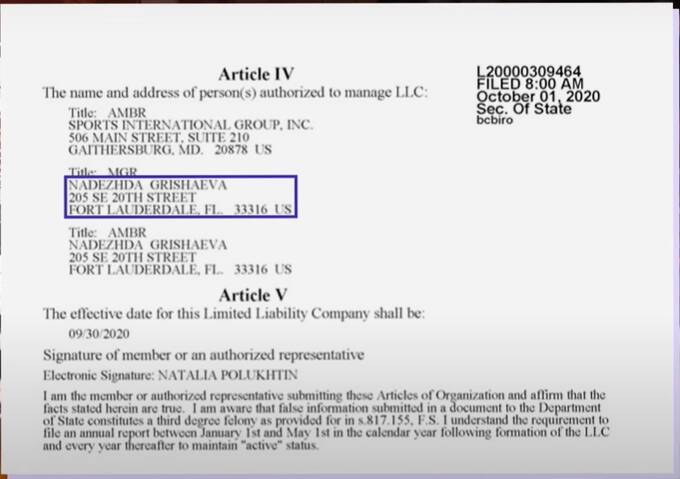 Имеется у Гришаевой кое-что и в столь ненавидимой ее покойным тестем Америке — в 2020 году в штате Флорида была зарегистрирована компания Sport International Group Inc.