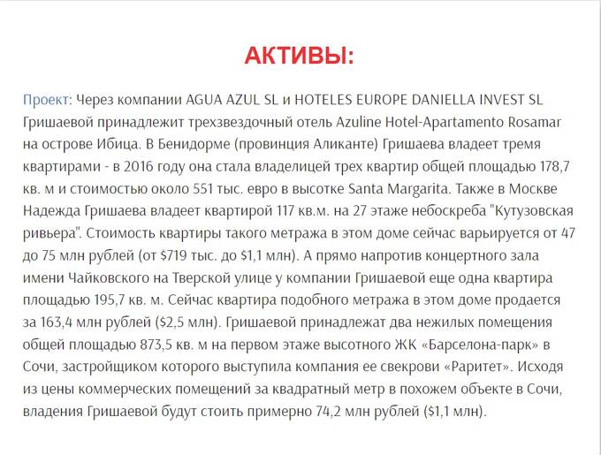 А эта полиция, в отличие от российской, к информации OCCRP относится серьезно. Так, согласно этой информации, у Надежды Гришаевой имеется отель на Ибице.