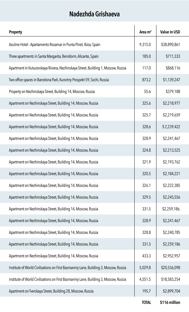 Согласно отчету, Надежда Сергеевна Гришаева могла использовать Daniella Invest, сеть отелей в Европе, для отмывания активов Жириновского. Гришаева владеет отелем-апартаментами Azuline Rosamar на Ибице и тремя квартирами в Бенидорме, приобретенными на сумму около 551 000 евро.