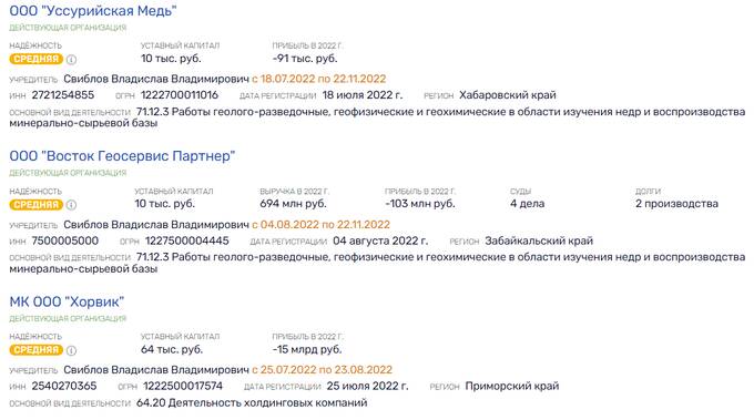 Вернемся в наши дни. Есть целый ряд компаний, где Владислав Свиблов выступал учредителем в личном качестве. Сегодня он из их капитала вышел, в некоторых остался через другие структуры. В период с 2022 года от записанных лично на него долей в ООО "Восток Геосервис Партнер", ООО "Уссурийская Медь", ООО "СБГК", ООО "Ай ДИ Эн Джи", МК ООО "Хорвик" и множестве других структур.