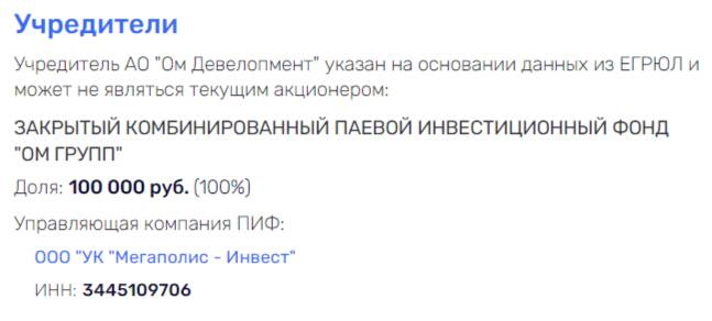 Гендиректором «ОМ Девелопмент» является выходец из «Инграда» Александр Пахоленко. А сама структура принадлежит ЗКПИФ «ОМ ГРУПП», владельцы которого скрыты. Этим фондом управляет ООО «УК «Мегаполис - Инвест».