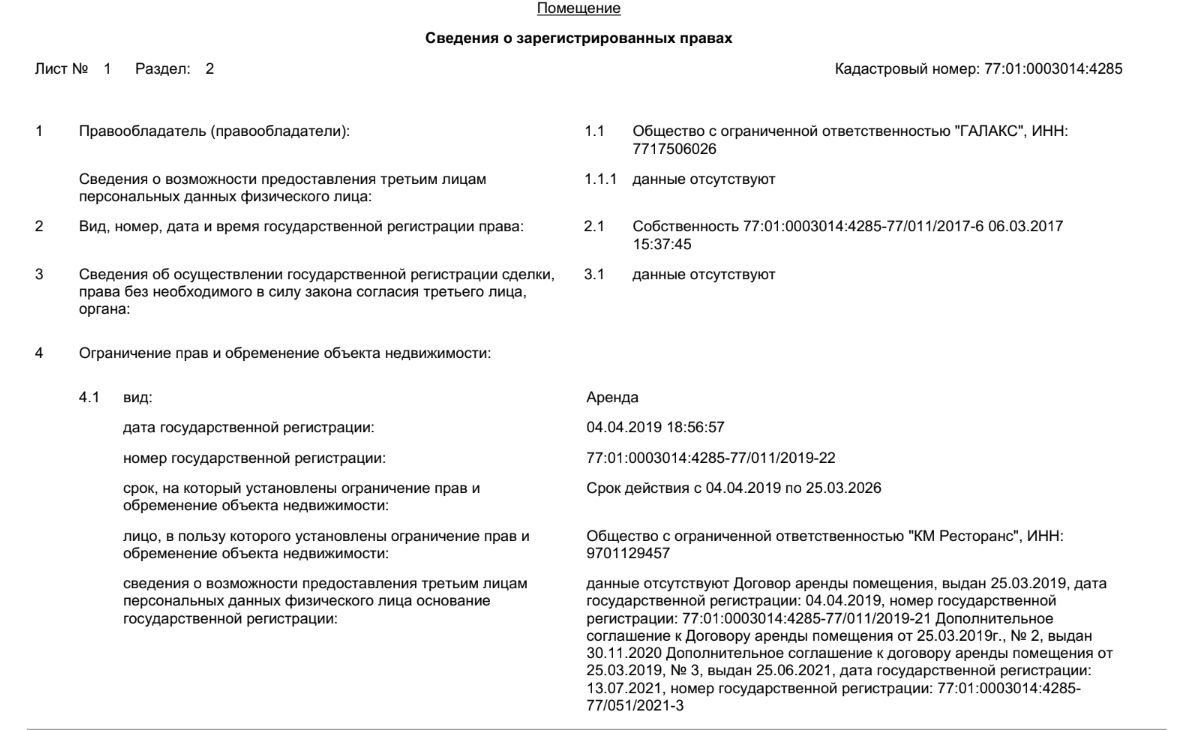 Помещение рядом с метро «Бауманская» (улица Ладожская, дом 1/2) площадью 345,5 кв. м за 110 млн рублей. Этот объект находится в аренде у «КМ Ресторанс» (ресторан «Сыто Пьяно»).