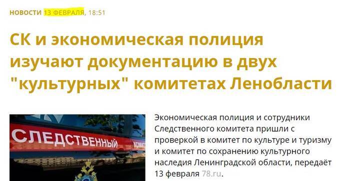 На этот раз речь идет о направлении культуры. Причина обысков – старое уголовное дело, открытое по факту массового хищения денежных средств во время реставрации Копорской крепости. Тогда главный фигурант уголовного производства Леся Колесникова со своими сообщниками «замутила» две трети из общей суммы в семь миллионов рублей. Подробнее о том, каким образом семья Колесниковых связана с господином Дрозденко и о причинах «поднятия» судебного разбирательства, читайте в данном материале.
