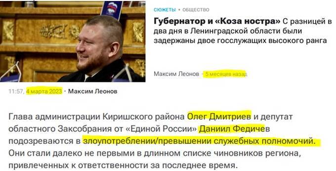 3. Далее буквально с разницей в день-другой, проходят аресты еще нескольких высокопоставленных чиновников из окружения губернатора. Речь идет о главе Киришской районной администрации Олеге Дмитриеве и депутате областного законодательного собрания – единороссе Данииле Федичеве, которые были арестованы за злоупотребление служебными полномочиями.
