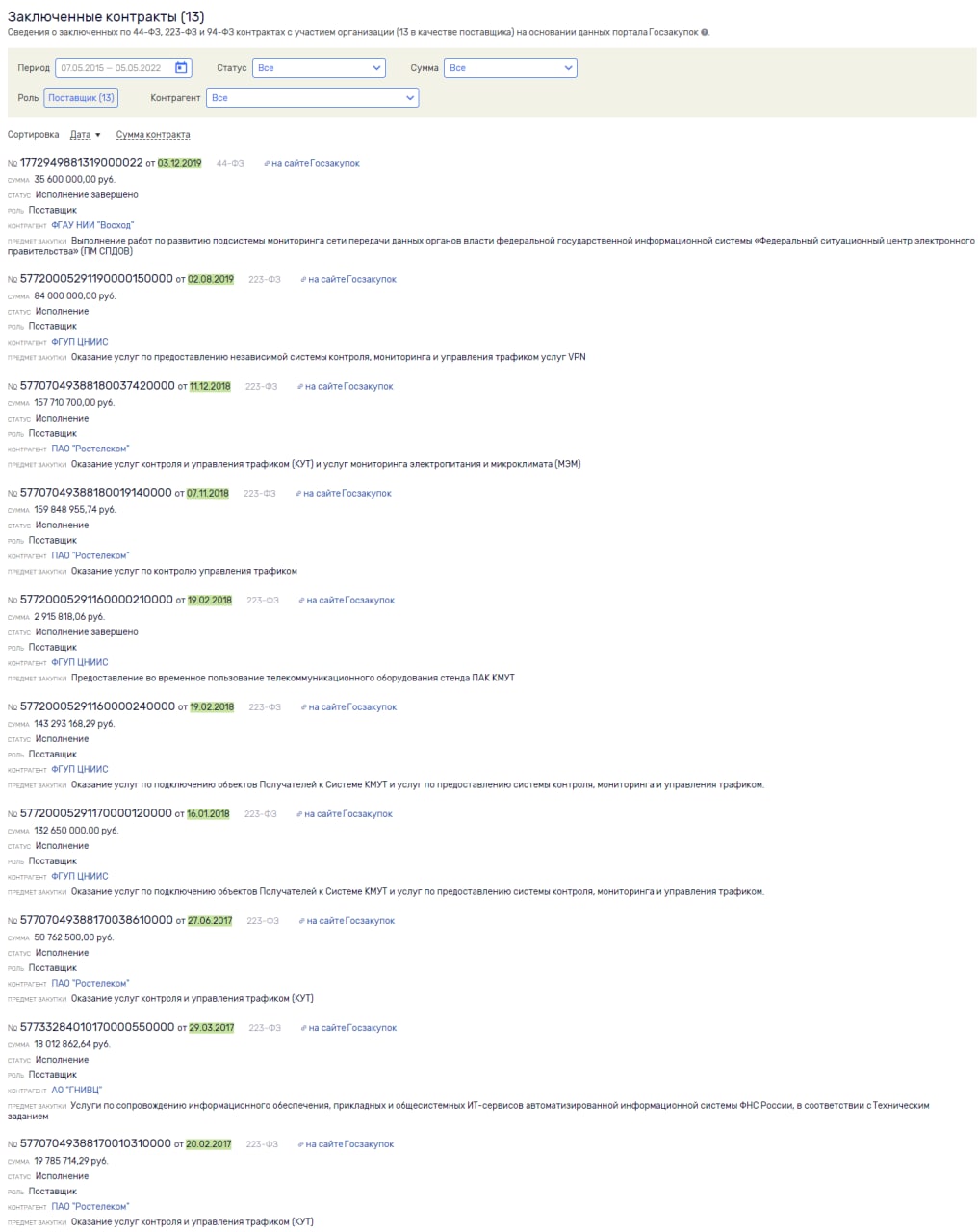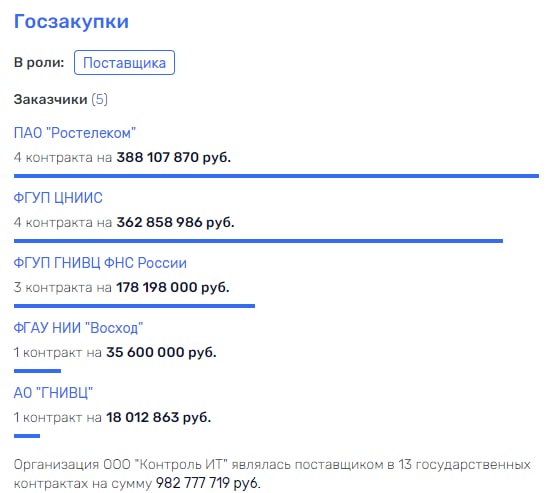 В итоге ООО "Контроль ИТ" стал поставщиком в 13 госконтрактах на астрономическую сумму в 982 777 719 рублей.